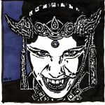 - Als oberste Schicht eine freie Interpretation des liturgischen Übergewandes irgendwo zwischen Kasel und Phelonion. Hier habe ich festen Canvas mit einen flauschigen Futterstoff kombiniert und anschließend mit silbernem Schrägband eingefasst, um die Verbindung zum Unterkleid herzustellen. Ich verwende zwar generell lieber Schurwollstoffe, möchte aber bei diesem Projekt einerseits aus Kostengründen hauptsächlich bereits vorhandene Materialien einsetzen, und andererseits soll noch ein großer Plot auf den Rücken des Überwurfes gebügelt werden. Das Material muss also hitzebeständig sein und die Transferfolie dauerhaft halten können. Böse Zungen munkelten etwas von wegen „sieht aus wie eine Inkontinenzunterlage“, deshalb müssen da unbedingt mehr Details ran. (Nein, Christian wars nicht.) Das gute Stück ist ergo noch nicht fertig.